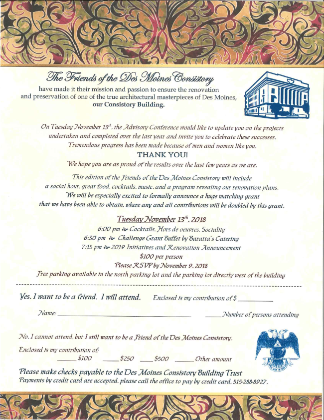 You can make your donation by calling (515-288-8927) or by mailing your check payable to the Des Moines Consistory Building Trust (519 Park Street, Des Moines, Iowa 50309). All contributions are tax deductible.